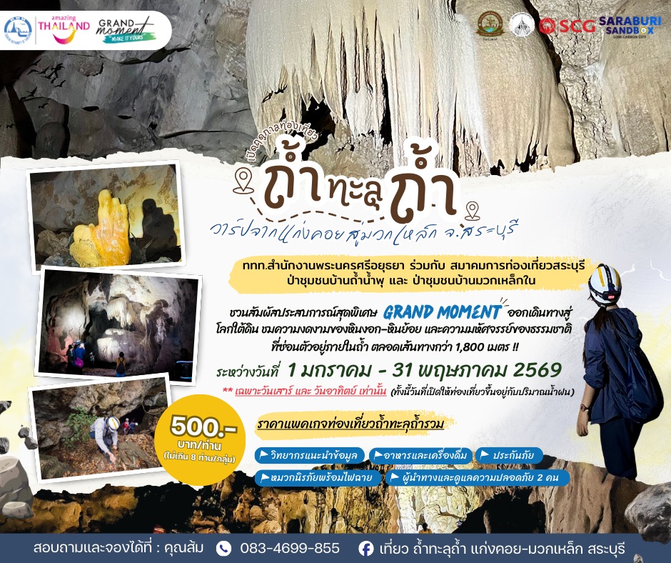 สัมผัสความมหัศจรรย์ของโลกใต้พิภพ ชมหินงอก–หินย้อยสุดอลังการ เรียนรู้ระบบนิเวศถ้ำ ผจญภัยอย่างปลอดภัย กับผู้นำทางชุมชน เริ่มต้นที่ ปากถ้ำลุมพินีสวนหิน (แก่งคอย) ทะลุออกปลายทาง ลำภูทอง (มวกเหล็ก)