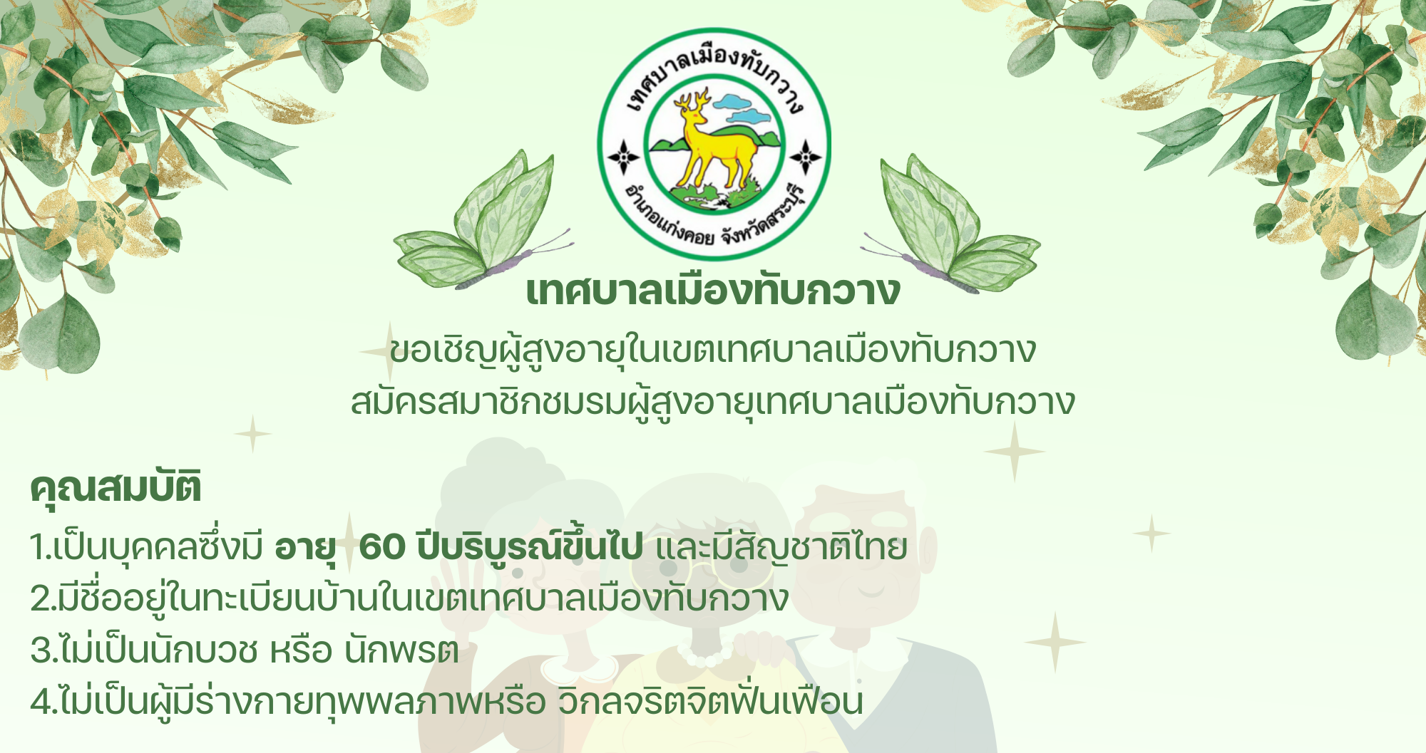 เทศบาลเมืองทับกวาง ขอเชิญผู้สูงอายุในเขตเทศบาลเมืองทับกวาง สมัครสมาชิกชมรมผู้สูงอายุเทศบาลเมืองทับกวาง คุณสมบัติ 1.เป็นบุคคลซึ่งมีอายุ 60 ปีบริบูรณ์ขึ้นไป และมีสัญชาติไทย 2.มีชื่ออยู่ในทะเบียนบ้านในเขตเทศบาลเมืองทับกวาง 3.ไม่เป็นนักบวช หรือนักพรต 4.ไม่เป็นผู้มีร่างกายทุพพลภาพหรือวิกลจริตจิตฟั่นเฟือน หลักฐานในการสมัคร 1.สำเนาทะเบียนบ้าน 2.สำเนาบัตรประจำตัวประชาชน สมัครได้ที่ กองสวัสดิการสังคม เทศบาลเมืองทับกวาง (ฝ่ายสังคมสงเคราะห์) โทร. 036-357590 ต่อ 105,106 facebook : https://www.facebook.com/share/19yKCaHqtR/ Line : https://line.me/R/ti/p/@320mysto?oat_content=qr